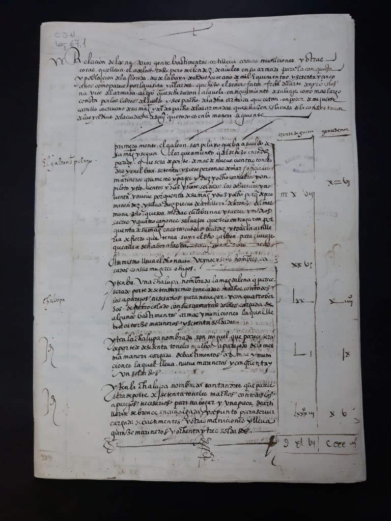 Item, va una chalupa nombrada la Magdalena que parece será de porte de setenta y cinco toneladas macho con todos los aparejos necesarios para navegar, y con cuatro versos de hierro colado con sus cámaras dobles, cargada de algunos bastimentos, armas y municiones, la cual lleva catorce marineros y setenta soldados.